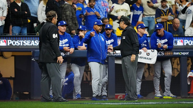 MILWAUKEE, WI - OCTOBER 13: Manager Dave Roberts #30 of the Los Angeles Dodgers talks to the umpiring crew during Game One of the National League Championship Series presented by loanDepot between the Los Angeles Dodgers and the Milwaukee Brewers at American Family Field on Monday, October 13, 2025 in Milwaukee, Wisconsin. (Photo by Mary DeCicco/MLB Photos via Getty Images)