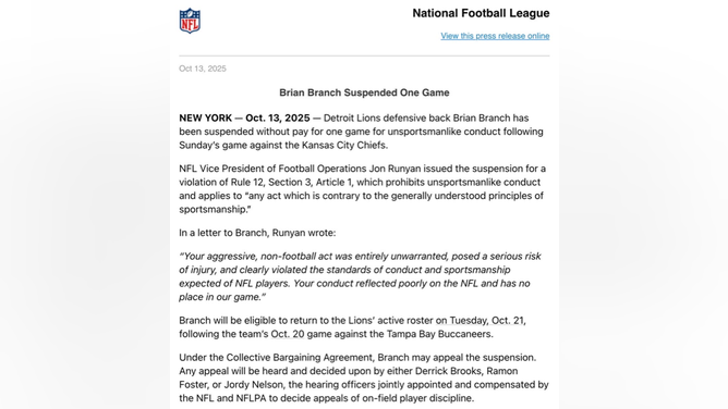If Branch elects not to appeal or loses an appeal, he will be eligible to return to the Lions' active roster on Tuesday, Oct. 21 and can return to the lineup after Detroit's scheduled bye week when the Lions face the Minnesota Vikings on Nov. 2.