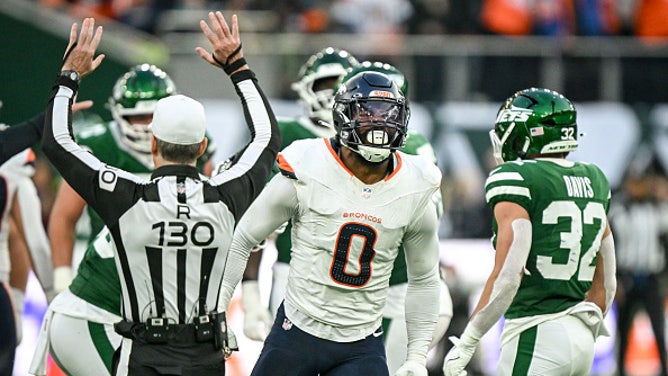 LONDON , ENGLAND - OCTOBER 12: Jonathon Cooper (0) of the Denver Broncos celebrates after sacking Justin Fields (7) of the New York Jets to seal the deal during the fourth quarter of the Broncos' 13-11 win at Tottenham Hotspur Stadium in London on Sunday, October 12, 2025. (Photo by AAron Ontiveroz/The Denver Post)
