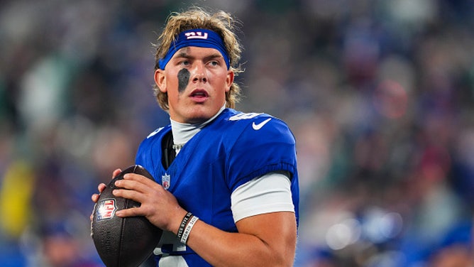 EAST RUTHERFORD, NJ - OCTOBER 09: JaxsonDart #6 of the New York Giants warms up prior to an NFL football game against the Philadelphia Eagles at MetLife Stadium on October 9, 2025 in East Rutherford, New Jersey. (Photo by Cooper Neill/Getty Images)