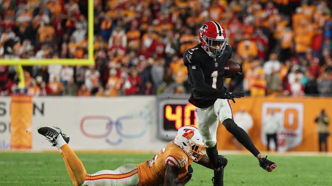 Dec 11, 2025; Tampa, Florida, USA; Atlanta Falcons wide receiver Darnell Mooney (1) breaks a tackle near the sideline against Tampa Bay Buccaneers cornerback Jamel Dean (35) during the fourth quarter at Raymond James Stadium. Mandatory Credit: Nathan Ray Seebeck-Imagn Images