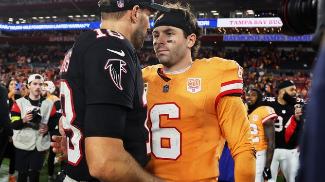 Dec 11, 2025; Tampa, Florida, USA; Atlanta Falcons quarterback Kirk Cousins (18) greets Tampa Bay Buccaneers quarterback Baker Mayfield (6) on the field after the game at Raymond James Stadium. Mandatory Credit: Kim Klement Neitzel-Imagn Images