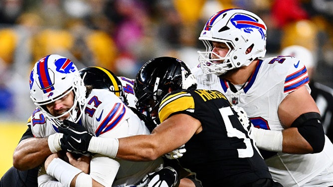 PITTSBURGH, PENNSYLVANIA - NOVEMBER 30: Cameron Heyward #97 and Alex Highsmith #56 of the Pittsburgh Steelers tackle Josh Allen #17 of the Buffalo Bills in the second quarter of a game at Acrisure Stadium on November 30, 2025 in Pittsburgh, Pennsylvania. (Photo by Joe Sargent/Getty Images)