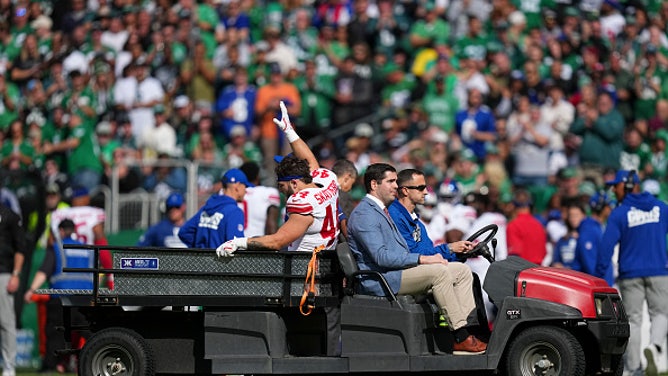 Cam Skattebo is carted off the field after an injury against the Philadelphia Eagles at Lincoln Financial Field.