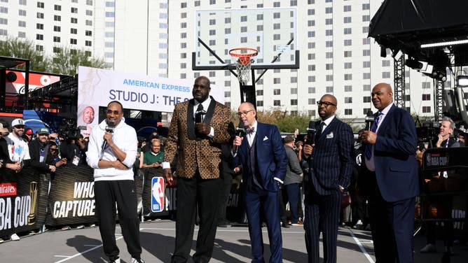 LAS VEGAS, NV - DECEMBER 14: Stephen A. Smith, Shaquille O'Neal, Ernie Johnson, Kenny Smith and Charles Barkley does pregame prior to the Emirates NBA Cup Semifinal game on December 14, 2024 at T-Mobile Arena in Las Vegas, Nevada. NOTE TO USER: User expressly acknowledges and agrees that, by downloading and/or using this Photograph, user is consenting to the terms and conditions of the Getty Images License Agreement. Mandatory Copyright Notice: Copyright 2024 NBAE (Photo by David Dow/NBAE via Getty Images)