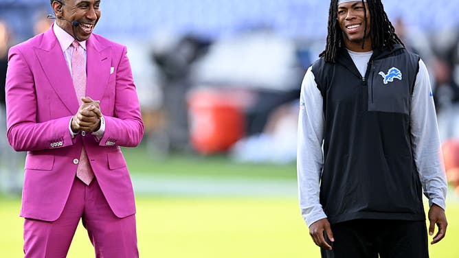 BALTIMORE, MARYLAND - SEPTEMBER 22: Stephen A. Smith and Jahmyr Gibbs #0 of the Detroit Lions speak prior to the game against the Baltimore Ravens at M&T Bank Stadium on September 22, 2025 in Baltimore, Maryland. (Photo by Greg Fiume/Getty Images)