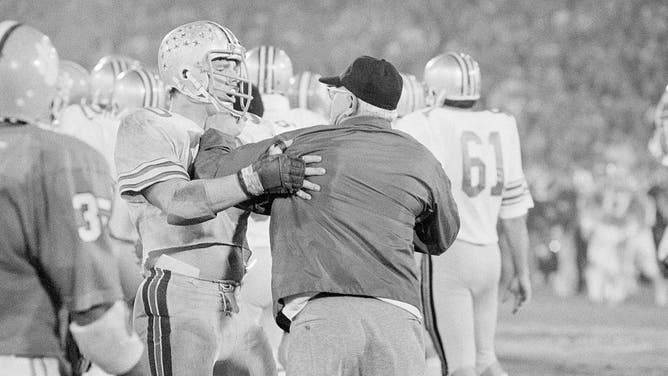 (Original Caption) Jacksonville, Fla.: Ohio State head football coach Woody Hayes takes a punch at one of his own players Ken Fritz (56) and offensive guard who is trying to retrain his coach during a melee during which Hayes also took a shot at a Clemson player.