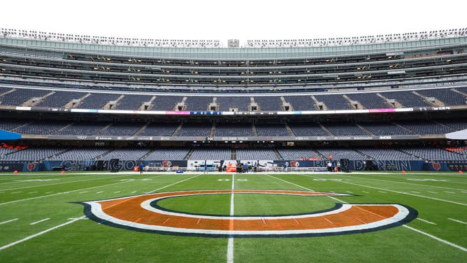 CHICAGO, IL - SEPTEMBER 29: Detailed view of the Chicago Bears logo prior to an NFL football game between the Los Angeles Rams and the Chicago Bears at Solider Field on September 29, 2024 in Chicago, IL. (Photo by Perry Knotts/Getty Images)