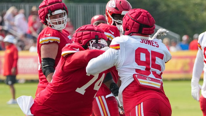 Jul 26, 2024; Kansas City, MO, USA; Kansas City Chiefs offensive tackle Jawaan Taylor (74) and defensive tackle Chris Jones (95) run drills during training camp at Missouri Western State University. Mandatory Credit: Denny Medley-USA TODAY Sports