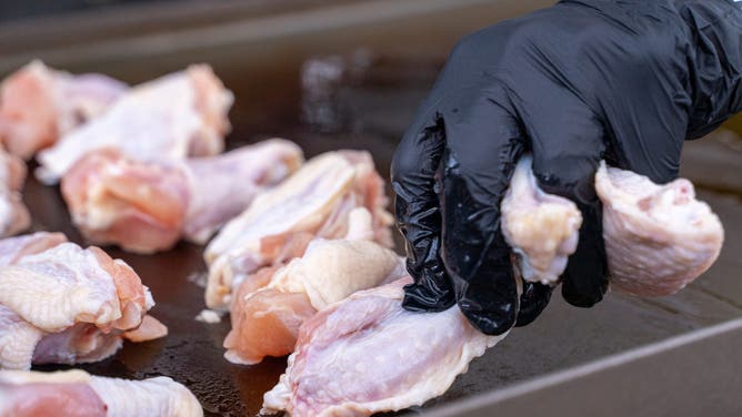 Raw chicken wings are placed on Josh Baker’s new Blackstone grill Aug 2, 2024, in Indianapolis, Ind. Baker brined the wings in salt water for 24 hours before cooking them on his griddle.