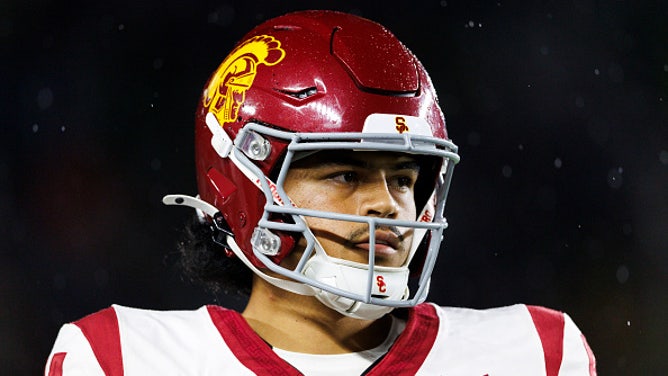 SOUTH BEND, INDIANA - OCTOBER 18: Jayden Maiava #14 of the USC Trojans during the game against Notre Dame Fighting Irish at Notre Dame Stadium on October 18, 2025 in South Bend, Indiana. (Photo by Ric Tapia/Getty Images)