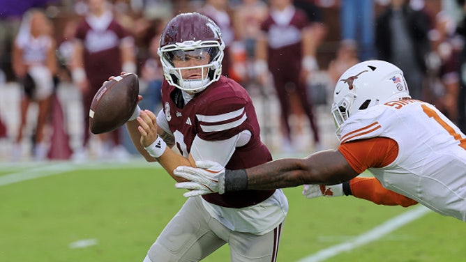 STARKVILLE, MS - OCTOBER 25: Mississippi State Bulldogs quarterback Blake Shapen (2) pressured by Texas Longhorns edge Colin Simmons (1) during the college football game between the Texas Longhorns and the Mississippi State Bulldogs on October 25, 2025, at Davis Wade Stadium in Starkville, Mississippi. (Photo by Jason Homan/Icon Sportswire via Getty Images)
