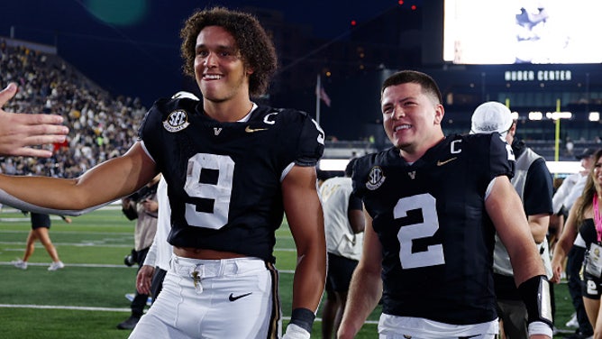NASHVILLE, TN - OCTOBER 25: Vanderbilt Commodores tight end Eli Stowers #9 and quarterback Diego Pavia #2 smile as they walk off the field following a game between the Vanderbilt Commodores and Missouri Tigers, October 25, 2025 at FirstBank Stadium in Nashville, Tennessee. (Photo by Matthew Maxey/Icon Sportswire via Getty Images)