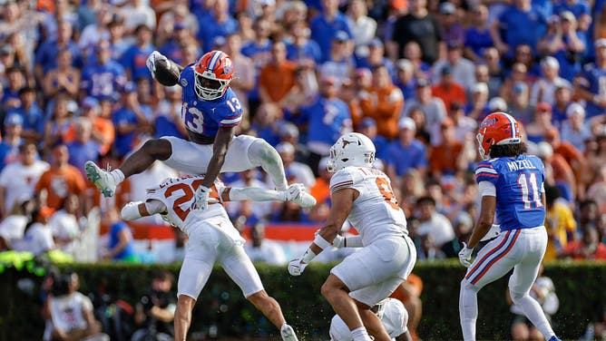 GAINESVILLE, FL - OCTOBER 04: Florida Gators running back Jadan Baugh (13) hurdles Texas Longhorns defensive back Graceson Littleton (29) during the game between the Texas Longhorns and the Florida Gators on October 4, 2025 at Ben Hill Griffin Stadium at Florida Field in Gainesville, Fl. (Photo by David Rosenblum/Icon Sportswire via Getty Images)