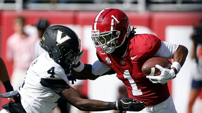 TUSCALOOSA, ALABAMA - OCTOBER 04: Isaiah Horton #1 of the Alabama Crimson Tide tries to get around Martel Hight #4 of the Vanderbilt Commodores as he carries the ball during the first quarter of a football game at Bryant-Denny Stadium on October 4, 2025 in Tuscaloosa, Alabama. (Photo by Butch Dill/Getty Images)