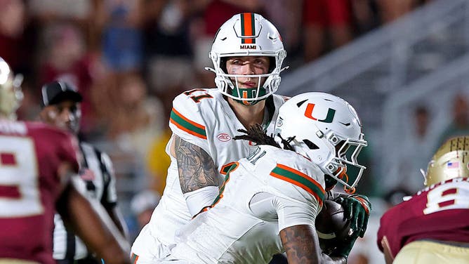 TALLAHASSEE, FLORIDA - OCTOBER 4: Carson Beck #11 of the Miami Hurricanes reads the defense as he hands the ball off to Mark Fletcher Jr. #4 of the Miami Hurricanes the game against the Florida State Seminoles at Doak S. Campbell Stadium on October 4, 2025 in Tallahassee, Florida. (Photo by Jason Clark/Getty Images)