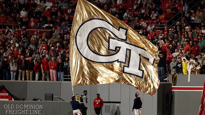 RALEIGH, NORTH CAROLINA - NOVEMBER 1: A cheerleader of the Georgia Tech Yellow Jackets waves a team flag during the game against the NC State Wolfpack at Carter-Finley Stadium on November 1, 2025 in Raleigh, North Carolina. (Photo by Lance King/Getty Images)