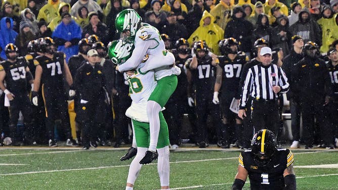 IOWA CITY, IA - NOVEMBER 08: Oregon place kicker Atticus Sappington (36) celebrates with Oregon punter James Ferguson-Reynolds (46) after kicking a game-winning 36-yard field goal during a Big Ten Conference college football game between the Oregon Ducks and the Iowa Hawkeyes, on November 8, 2025, at Kinnick Stadium in Iowa City, IA. (Photo by Keith Gillett/Icon Sportswire via Getty Images)