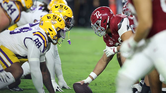 TUSCALOOSA, ALABAMA - NOVEMBER 08: The Alabama Crimson Tide offense lines up against the LSU Tigers defense during the third quarter at Bryant-Denny Stadium on November 08, 2025 in Tuscaloosa, Alabama. (Photo by Kevin C. Cox/Getty Images)