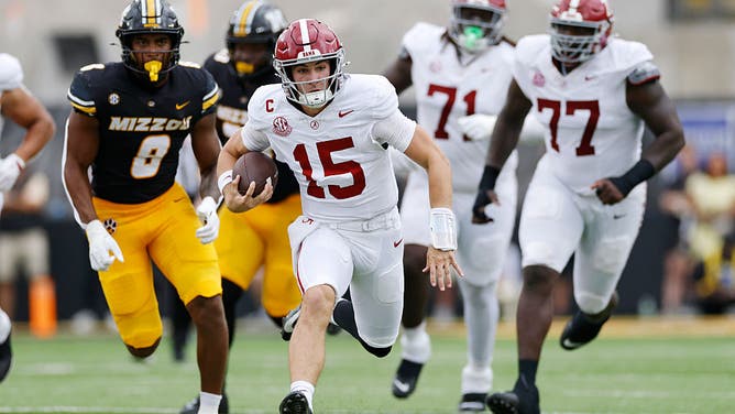 COLUMBIA, MO - OCTOBER 11: Ty Simpson #15 of the Alabama Crimson Tide runs with the ball for a first down during a college football game against the Missouri Tigers on October 11, 2025 at Memorial Stadium/Faurot Field in Columbia, Missouri. (Photo by Joe Robbins/Icon Sportswire via Getty Images)
