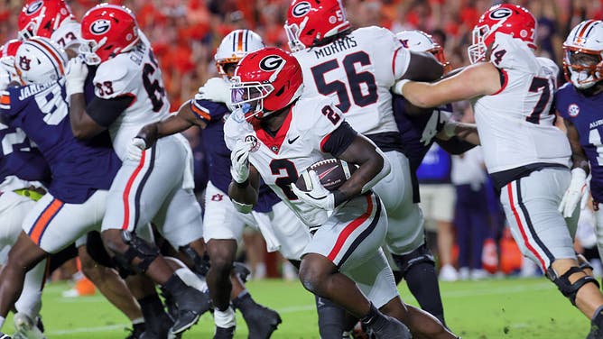 AUBURN, AL - OCTOBER 11: Georgia Bulldogs Running Back Josh McCray (2) runs the ball during a game between the Auburn Tigers and the Georgia Bulldogs at Jordan-Hare Stadium on October 11, 2025 in Auburn, Alabama.(Photo by Jason Homan/Icon Sportswire via Getty Images)