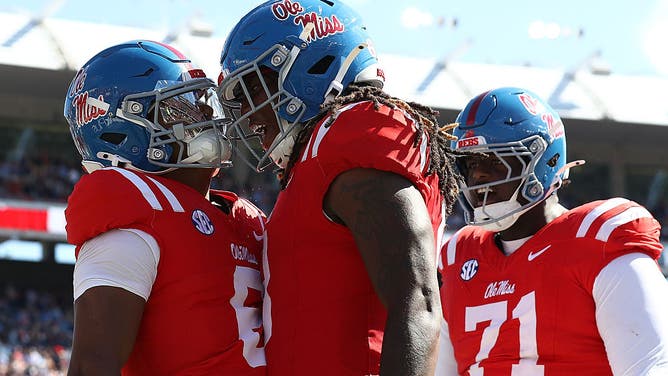 OXFORD, MISSISSIPPI - OCTOBER 11: Trinidad Chambliss #6 of the Mississippi Rebels, Dae'Quan Wright #8 of the Mississippi Rebels and PJ Wilkins #71 of the Mississippi Rebels reacts after a touchdown during the second half against the Washington State Cougars at Vaught-Hemingway Stadium on October 11, 2025 in Oxford, Mississippi. (Photo by Justin Ford/Getty Images)