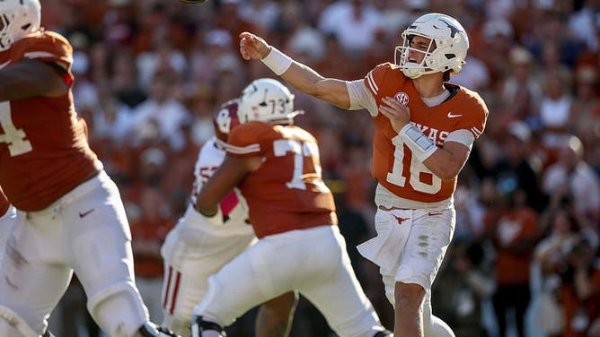 DALLAS, TEXAS - OCTOBER 11: Arch Manning #16 of the Texas Longhorns throws a pass in the second half against the Oklahoma Sooners at Cotton Bowl on October 11, 2025 in Dallas, Texas. (Photo by Tim Warner/Getty Images)