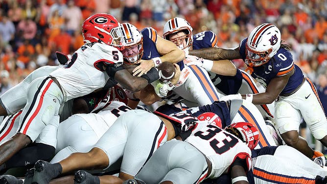 AUBURN, ALABAMA - OCTOBER 11: Raylen Wilson #5 of the Georgia Bulldogs punches out the ball as Jackson Arnold #11 of the Auburn Tigers dives for the end zone during the second quarter at Jordan-Hare Stadium on October 11, 2025 in Auburn, Alabama. After an official review, the ball was ruled a fumble recovered by the Georgia Bulldogs. (Photo by Kevin C. Cox/Getty Images)