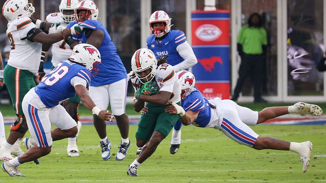 DALLAS, TX - NOVEMBER 01: Miami (FL) Hurricanes wide receiver Malachi Toney (10) fights for yards during the game between SMU and Miami on November 1, 2025 at Gerald J. Ford Stadium in Dallas, TX. (Photo by George Walker/Icon Sportswire via Getty Images)