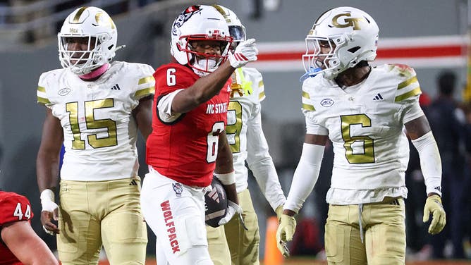 RALEIGH, NC - NOVEMBER 01: Wesley Grimes #6 of the North Carolina State Wolfpack signals the first down during the college football game between the North Carolina State Wolfpack and the Georgia Tech Yellow Jackets on November 1, 2025 at Carter-Finley Stadium in Raleigh, NC. (Photo by Nicholas Faulkner/Icon Sportswire via Getty Images)
