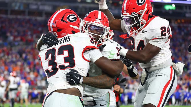 JACKSONVILLE, FLORIDA - NOVEMBER 01: Chauncey Bowens #33 of the Georgia Bulldogs celebrates with teammate Nate Frazier #3 after rushing for a touchdown against the Florida Gators during the fourth quarter of the game at EverBank Stadium on November 01, 2025 in Jacksonville, Florida. (Photo by Megan Briggs/Getty Images)