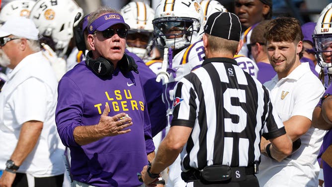 NASHVILLE, TN - OCTOBER 18: Louisiana State Tigers head coach Brian Kelly discusses a penalty call with a game official during a game between the Vanderbilt Commodores and Louisiana State Tigers, October 18, 2025, at FirstBank Stadium in Nashville, Tennessee. (Photo by Matthew Maxey/Icon Sportswire via Getty Images)