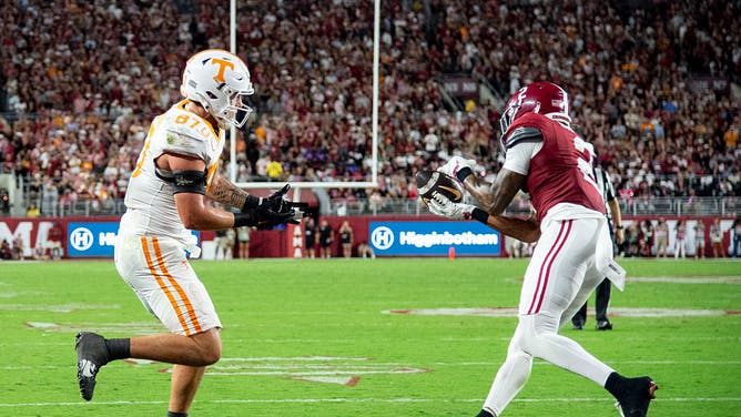 TUSCALOOSA, ALABAMA - OCTOBER 18: Defensive back Zabien Brown #2 of the Alabama Crimson Tide intercepts a pass intended for tight end Miles Kitselman #87 of the Tennessee Volunteers during the first half of play at Bryant-Denny Stadium on October 18, 2025 in Tuscaloosa, Alabama. (Photo by Michael Chang/Getty Images)