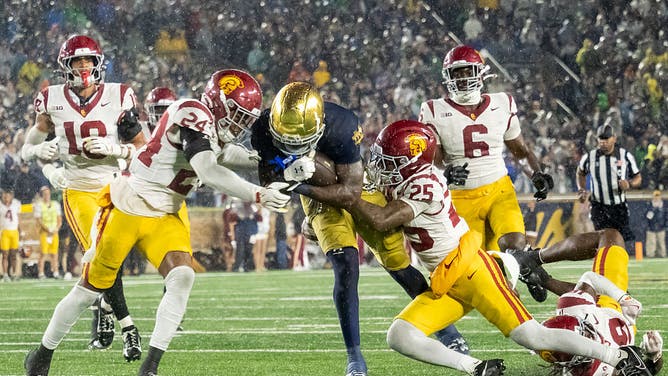 SOUTH BEND, IN - OCTOBER 18: Notre Dame Fighting Irish running back Jeremiyah Love (4) runs the ball against Southern California Trojans safety Christian Pierce (24) and Southern California Trojans cornerback Marcelles Williams (25) during the game between Southern California Trojans Southern California Trojans and Notre Dame Fighting Irish on October 18, 2025 at Notre Dame Stadium in South Bend, IN. (Photo by Joseph Weiser/Icon Sportswire via Getty Images)