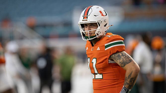 MIAMI GARDENS, FLORIDA - OCTOBER 17: Carson Beck #11 of Miami Hurricanes is pictured during warmups before the game against Louisville at Hard Rock Stadium on October 17, 2025 in Miami Gardens, Florida. (Photo by Michael Pimentel/ISI Photos/ISI Photos via Getty Images)