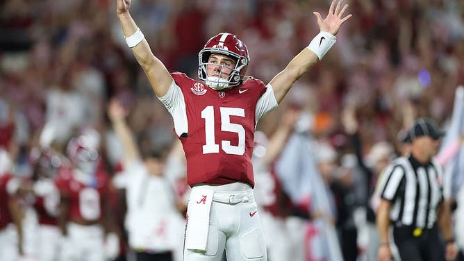 TUSCALOOSA, ALABAMA - OCTOBER 18: Ty Simpson #15 of the Alabama Crimson Tide reacts after passing for a touchdown against the Tennessee Volunteers during the second quarter at Bryant-Denny Stadium on October 18, 2025 in Tuscaloosa, Alabama. (Photo by Kevin C. Cox/Getty Images)