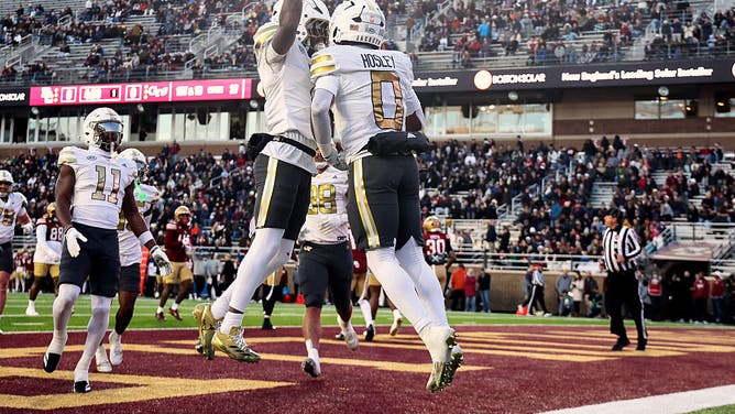 CHESTNUT HILL, MA - NOVEMBER 15: Malachi Hosley #0 of the Georgia Tech Yellow Jackets celebrates his touchdown with Malik Rutherford #8 during the first half against the Boston College Eagles at Alumni Stadium on November 15, 2025 in Boston, Massachusetts. (Photo By Winslow Townson/Getty Images)
