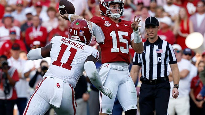 TUSCALOOSA, ALABAMA - NOVEMBER 15: Ty Simpson #15 of the Alabama Crimson Tide throws a pass while under pressure from Kobie McKinzie #11 of the Oklahoma Sooners during the second quarter of a football game at Bryant Denny Stadium on November 15, 2025 in Tuscaloosa, Alabama. (Photo by Butch Dill/Getty Images)