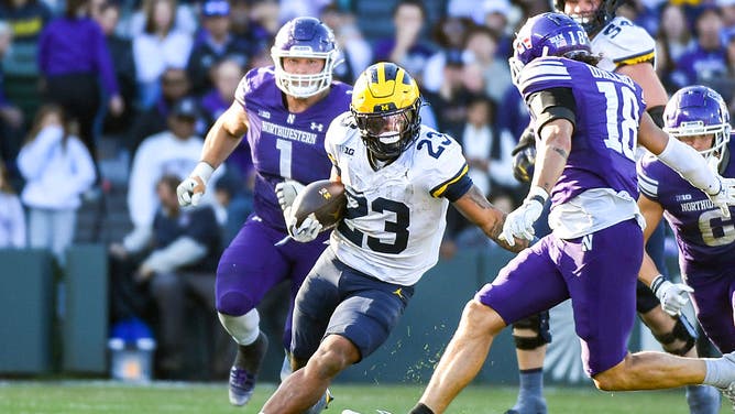 CHICAGO, ILLINOIS - NOVEMBER 15: Jordan Marshall #23 of the Michigan Wolverines runs with the ball for yardage against Garner Wallace #18 and Carmine Bastone #1 during the second half of a college football game against the Northwestern Wildcats at Wrigley Field on November 15, 2025 in Chicago, Illinois. The Michigan Wolverines won the game 24-22. (Photo by Aaron J. Thornton/Getty Images)