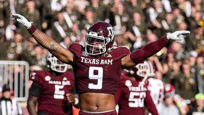 COLLEGE STATION, TEXAS - NOVEMBER 15: Cashius Howell #9 of the Texas A&M Aggies reacts during the fourth quarter against the South Carolina Gamecocks at Kyle Field on November 15, 2025 in College Station, Texas. (Photo by Maria Lysaker/Getty Images)