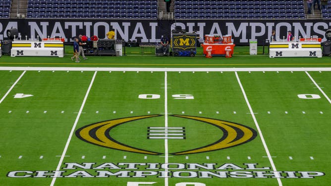 The CFB National Championship logo is set midfield before the College Football Playoffs National Championship game Michigan Wolverines and Washington Huskies on January 8, 2024, at NRG Stadium in Houston, Texas. (Photo by David Buono/Icon Sportswire via Getty Images)