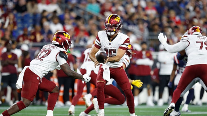 FOXBOROUGH, MA - AUGUST 08: Washington Commanders quarterback Sam Hartman (15) hands off to Washington Commanders running back Jacory Croskey-Merritt (32) during the NFL preseason game between Washington Commanders and New England Patriots on August 8, 2025, at Gillette Stadium in Foxborough, MA. (Photo by M. Anthony Nesmith/Icon Sportswire via Getty Images)