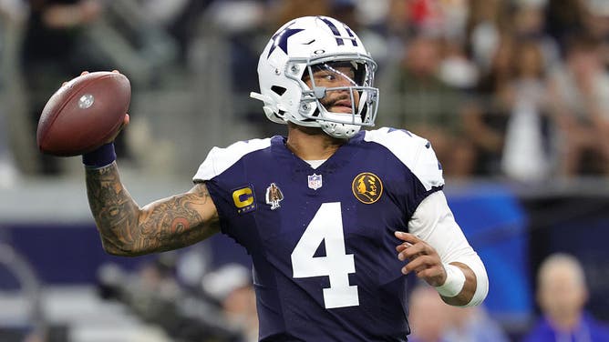 ARLINGTON, TEXAS - NOVEMBER 27: Dak Prescott #4 of the Dallas Cowboys passes the ball against the Kansas City Chiefs during the first quarter in the game at AT&T Stadium on November 27, 2025 in Arlington, Texas. (Photo by Stacy Revere/Getty Images)
