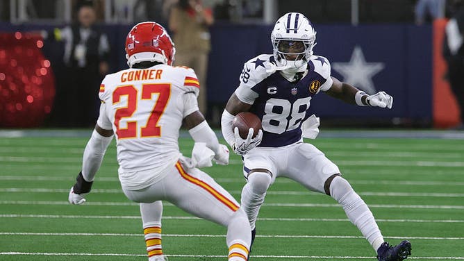 ARLINGTON, TEXAS - NOVEMBER 27: CeeDee Lamb #88 of the Dallas Cowboys carries the ball against Chamarri Conner #27 of the Kansas City Chiefs during the second quarter in the game at AT&T Stadium on November 27, 2025 in Arlington, Texas. (Photo by Stacy Revere/Getty Images)