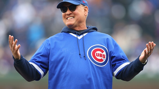 CHICAGO, ILLINOIS - APRIL 01: Hall of Fame player and former Chicago Cubs Ryne Sandberg reacts before throwing out the ceremonial first pitch prior to the game against the Colorado Rockies at Wrigley Field on April 01, 2024 in Chicago, Illinois. (Photo by Michael Reaves/Getty Images)