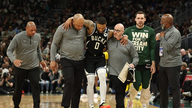 MILWAUKEE, WISCONSIN - APRIL 27: Damian Lillard #0 of the Milwaukee Bucks is helped off the court after an apparent injury during the first quarter in Game Four of the Eastern Conference First Round NBA Playoffs against the Indiana Pacers at Fiserv Forum on April 27, 2025 in Milwaukee, Wisconsin. (Photo by Stacy Revere/Getty Images)