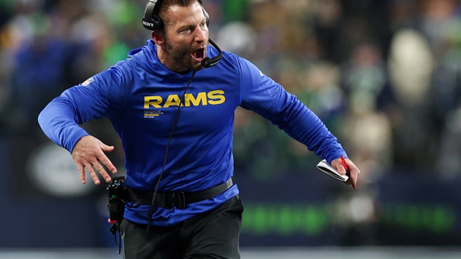 SEATTLE, CA - JANUARY 25: Los Angeles Rams head coach Sean McVay celebrates a touchdown by wide receiver Davante Adams (17) during the third quarter of the NFC championship game against the Seattle Seahawks at Lumen Field on Sunday, Jan. 25, 2026 in Seattle, CA. (Robert Gauthier / Los Angeles Times via Getty Images)