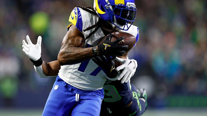 SEATTLE, WASHINGTON - JANUARY 25: Davante Adams #17 of the Los Angeles Rams catches a pass in front of Josh Jobe #29 of the Seattle Seahawks during the third quarter in the NFC Championship game at Lumen Field on January 25, 2026 in Seattle, Washington. (Photo by Ronald Martinez/Getty Images)