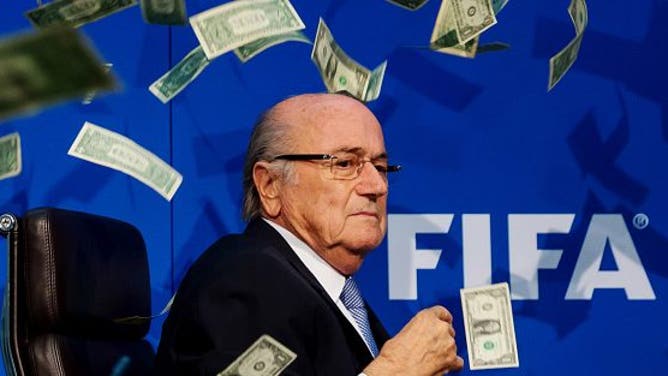 ZURICH, SWITZERLAND - JULY 20: Comedian Simon Brodkin (not pictured) throws dollar bills at FIFA President Joseph S. Blatter during a press conference at the Extraordinary FIFA Executive Committee Meeting at the FIFA headquarters on July 20, 2015 in Zurich, Switzerland. (Photo by Philipp Schmidli/Getty Images)