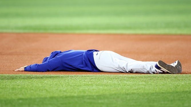 TORONTO, ON - OCTOBER 30: Manager Dave Roberts of the Los Angeles Dodgers lays on the ground between second and third base after falling while having a running race with Hyeseong Kim #6 during a workout day ahead of game six of the 2025 World Series at Rogers Centre on October 30, 2025 in Toronto, Ontario, Canada. (Photo by Vaughn Ridley/Getty Images)